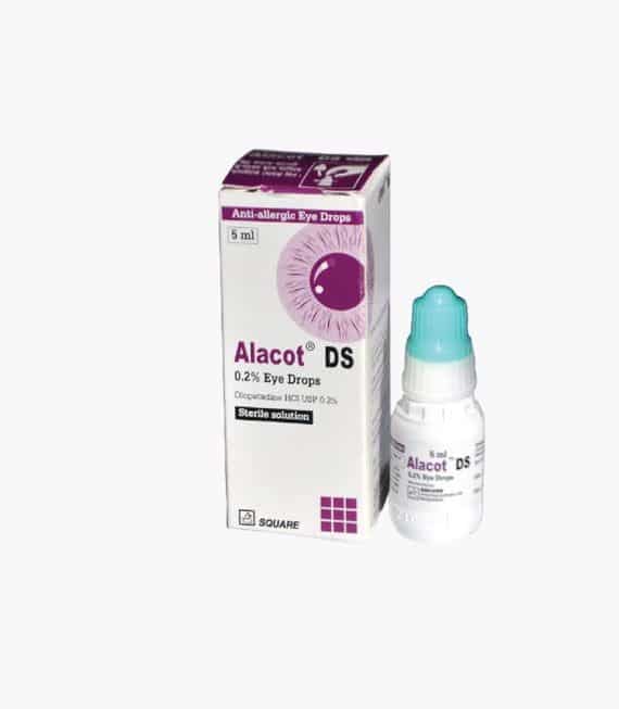 Alacot DS Eye Drops contains Olopatadine hydrochloride 0.2%, a selective H1 receptor antagonist. They are indicated for the treatment of allergic conjunctivitis, including symptoms like: Itching and irritation of the eyes Redness of the eyes Watery or tearing eyes Swollen eyelids or conjunctival inflammation The drops are also effective for seasonal allergies triggered by allergens such as pollen, dust, animal fur, and other environmental factors.